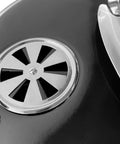 Parrilla con estructura robusta y elegante, con terminación en esmalte negro brillante
