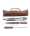 Lleva tu pasión por la parrilla al siguiente nivel con el Set Parrillero Feroz, un trío indispensable de herramientas diseñado para quienes disfrutan el ritual del fuego con estilo, precisión y calidad. Este set reúne lo esencial para cualquier parrillero exigente: cuchillo, tenaza y chaira, todo presentado en un elegante porta cuchillos de cuero.
